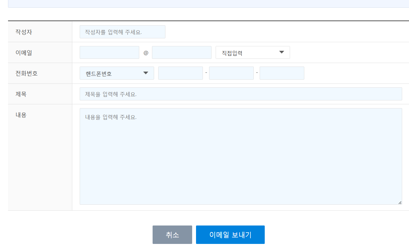 그리고 작성자, 이메일, 전화번호, 제목, 내용을 적어주시면 되는데.