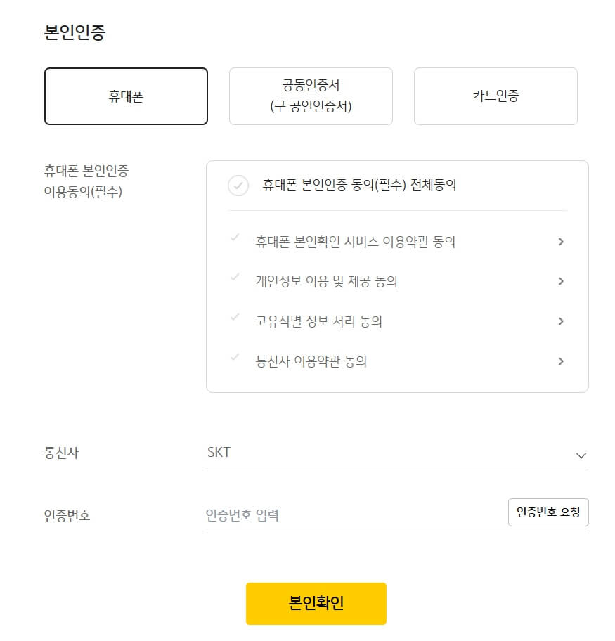 휴대전화, 공동인증서를 이용해 본인인증해주시고,