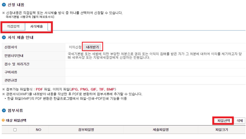 4. 직접 입력하거나 서식 제출하는 란이 있습니다. 만약 서식에 써서 내고 싶으시면 내려받기를 클릭하신 후 다운 받으셔서 작성하시면 됩니다.