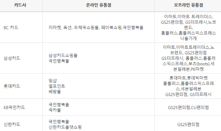 사용 가능 유통점은 다음과 같습니다.