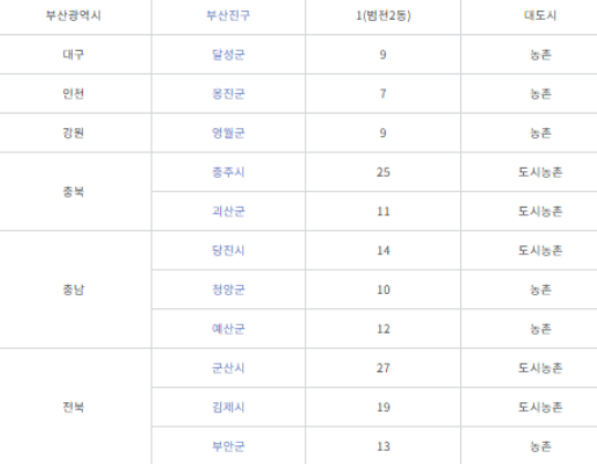 충남 당진시·청양군·예산군, 전북 군산시·김제시·부안군, 전남 곡성군·강진군·해남군·영광군·장성군,