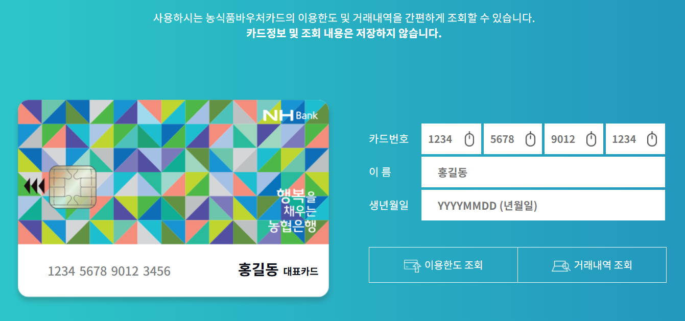사용하시는 농식품바우처카드의 이용한도나 거래내역을 간편하게 조회해볼 수 있습니다.