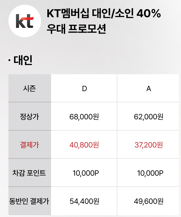 KT 멤버쉽 회원에 한해서 40% 할인이 가능하구요.