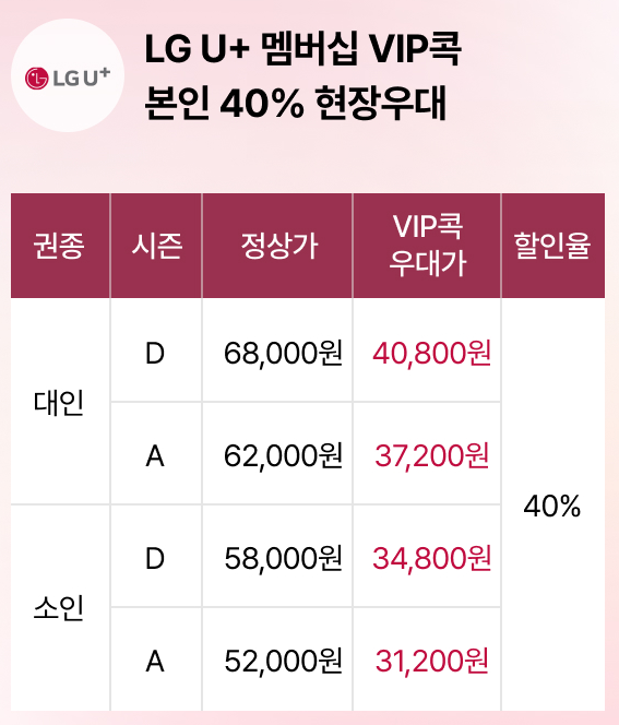 LG 유+ 멤버십에 가입되어있다면 40% 현장우대 특전이 있네요