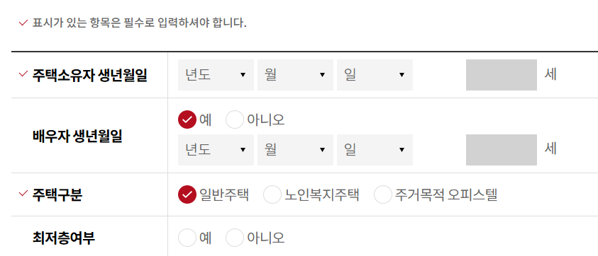 1. 주택 소유자의 생년월일, 배우자의 생년월일을 입력합니다.