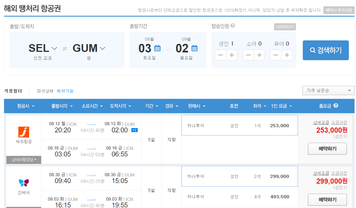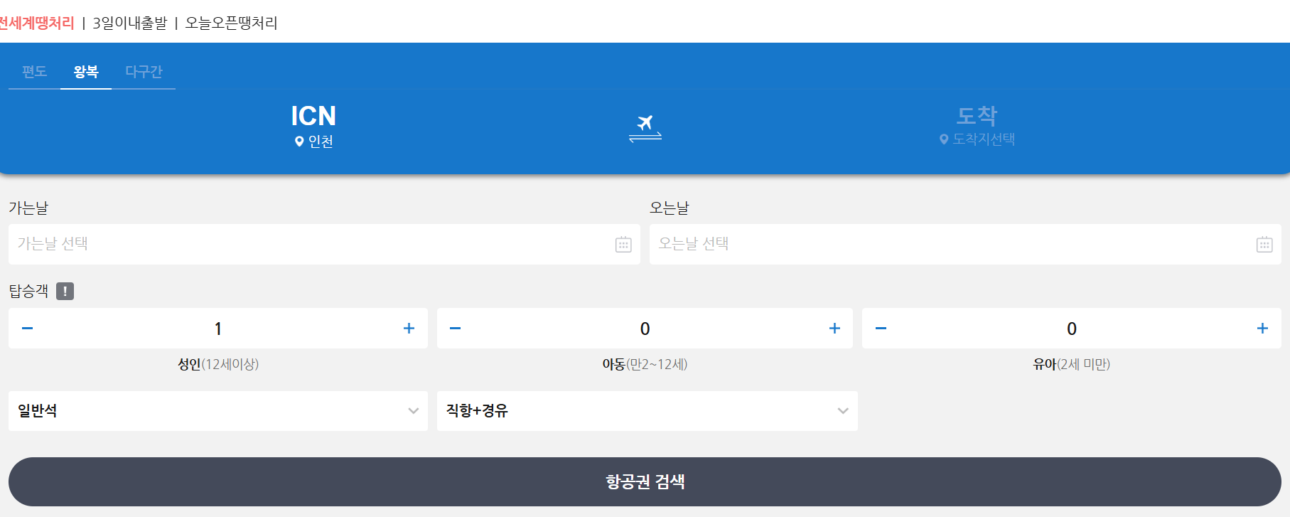 출발기간, 복귀 날짜, 탑승인원을 선택하고 검색하시면 땡처리 예약가능 상품을 조회하실 수 있어요.