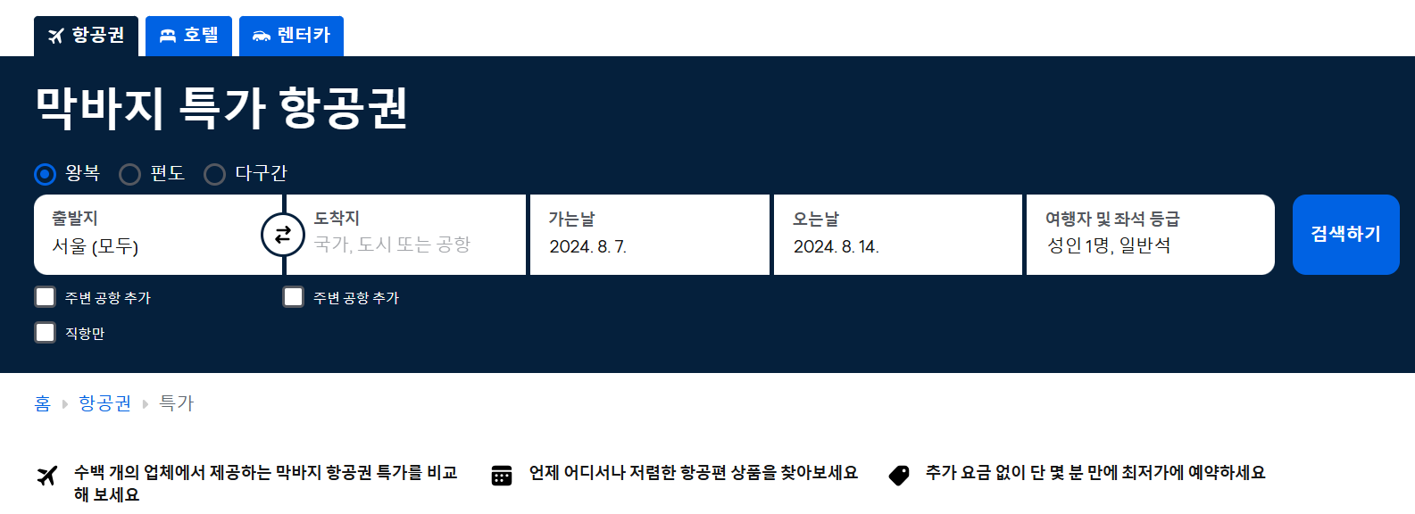 수백개의 업체에서 제공하는 막바지 항공권 특가를 비교해서 알려주는 사이트 입니다.