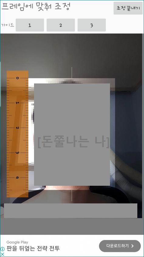 왼쪽에 주황색 줄자가 나오는데 이거에 맞춰서 사진을 움직여서 맞춰줍니다. 움직이기 좀 애매하시면 가이드 1,2,3을 통해 사진을 조정해보실 수 있습니다.