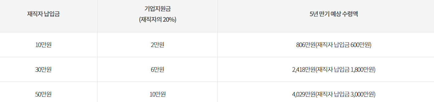 재직자의 납입금과 음행금리 우대 + 기업지원금(재직자 납입금의 20%) + 정부 세제 지원금(손비, 소득세 감면)을 계산하여 결정됩니다.