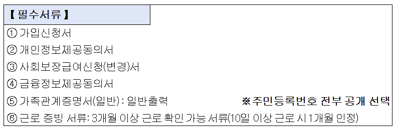 아래 가입 신청서, 개인정보동의서, 금융정보제공 동의서, 근로사실 증빙 서류가 필요합니다. 서식 및 추가 참고 내용은 아래에서 바로 받으실 수 있습니다.
