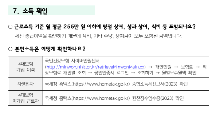 ④ 본인 근로소득 세전 월평균 255만원 이하 (기준 기간: 2023. 6. 1. ~ 2024. 5. 31.)