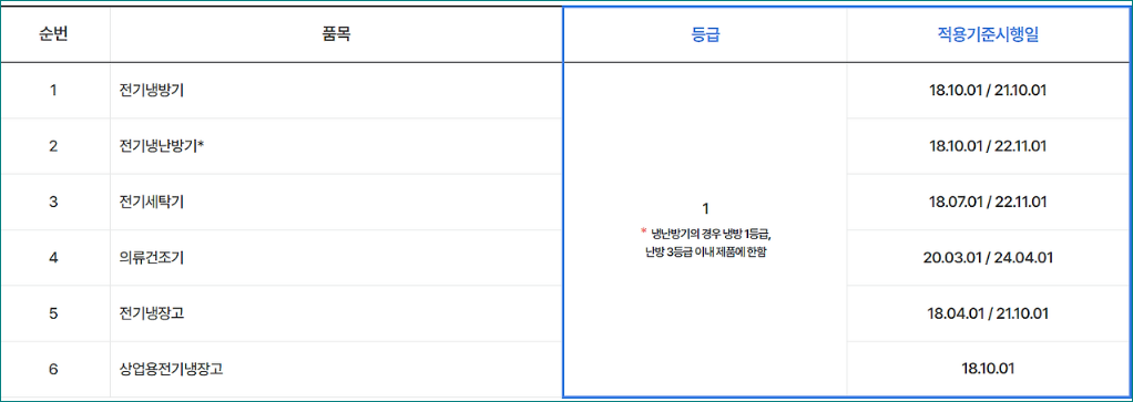 더 구체적으로 말씀드리면, 에어컨의 경우는 1등급이어야 하며 난방기의 경우 3등급 이내여야 합니다.
